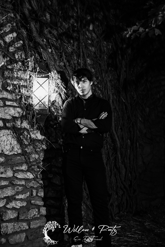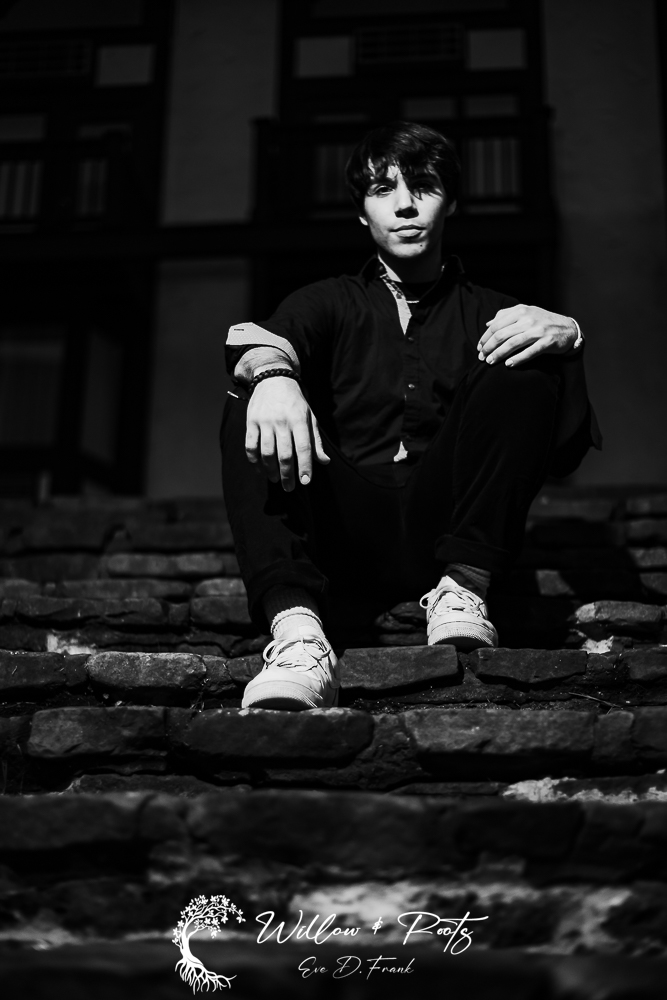 We started at the Main Lodge with it’s epic looking stone walls. The entire place is built to look like an old manor house or inn from Europe. The Main Lodge also features some gorgeous Ivy on the front of the building. Because of the mysterious feel of the property I went with a dark & moody vibe for his senior photos at the Peak. We also found a side staircase the staff uses to enter the building and I set up a flash for some interesting lighting. We ducked inside for a bit to capture some magic in front of the gorgeous carved fireplace in the lobby of the Main Lodge where many a chilled skier has sipped hot cocoa and warmed their feet.